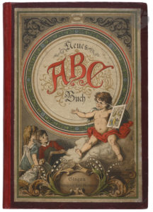 l’éditeur, dos de percaline carmin, plats de papier bordeaux, chromolithographie appliquée sur le premier, titre dans un cercle orné, angelot à lunettes tenant une planche d’alphabet, couple de jeunes enfants avec livre et poupée en pied.