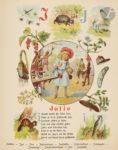 Abécédaire des prénoms lithographié en vifs coloris sur un fort papier. Une page par lettre (pas de I, x et Y sur la même). Initiales gothique et latine en tête, une scène avec un enfant dans un cercle central, son prénom en bleu ou en rouge, quelques vers de mirliton décrivant la scène en pied. Le reste de la page est rempli de nombreux objets et animaux dont le nom débute par l’initiale. Alexander à Zerline.