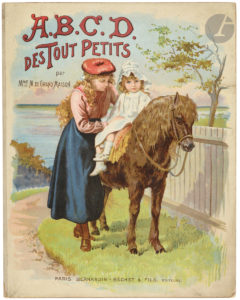 cartonnées souples, chromolithographie sur la première, une mère tenant sa fille sur un poney.