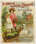 • Alphabet des scènes enfantines. Bernardin Béchet & fils, éditeurs. Paris. [Vers 1890]. In-4 (27,7 x 22 cm). (14) pp. : couvertures cartonnées souples, la première chromolithographiée, deux petites filles au bord d’un étang nourrissant un cygne. Et série identique, toujours avec la même mise en pages :