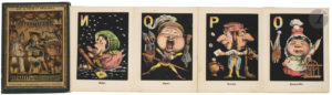 (15,5 x 11,7 cm). Leporello de (24) planches lithographiées en couleurs sur fond noir : cartonnage de l’éditeur de papier vert lierre, titre lithographié en couleurs appliqué sur le premier plat et encadré d’une frise de papier gaufré doré, Pierrot, joueur de grosse caisse et fillette grotesque sur une scène.