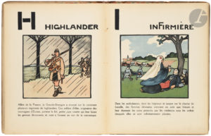 HELLÉ (André). — Alphabet de le Grande Guerre 1914-1916. — Texte et dessins de André Hellé. Berger-Levrault. 5 et 7 rue des Beaux-Arts. Paris. [1916]. In-4 (32,2 x 25 cm). (1) f. blanc, (29), (1) pp. : album de l’éditeur, dos de toile...