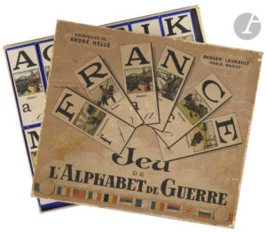 Extrêmement rare déclinaison en jeu de l’Alphabet de la Grande Guerre par l’artiste André Hellé (1871-1945), reprenant images et légendes de l’album [cf. n° 192].