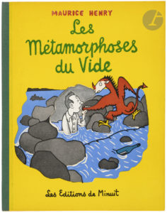 HENRY (Maurice). — Les Métamorphoses du vide. — Les Éditions de Minuit. [Paris. 1955]. In-4 (27 x 21 cm). (64) pp. [la moitié avec découpes] : dos de toile verte, premier plat jaune d’or illustré en couleurs avec découpe centrale...