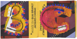 Après une visite au Musée des arts premiers, il en récupère des sacs de papier, portant le nom du musée sur une bande verticale jaune en marge, en garde les soufflets, découpe les anses de ficelle noire et les applique en forme des vingt-six lettres sur ses tableaux, à la matière profonde, figurant des masques primitifs — à sa façon. Il reprend dans ses gouaches épaisses les coloris de base des sacs, y ajoutant luminosité dans ses fuchsia, jaunes, orangés et bleus. Double planche pour le N et achevé de réaliser, avec la même matière sur fond jaune d’or, où il invite le lecteur à reprendre le cours du leporello.
