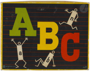 [JEU]. — ABC.— Édition Carlit. Zürich. [Vers 1950]. Boite de carton (20,3 x 27,3 x 2,8 cm). Renfermant 25 images appliquées sur carton, 25 cartons avec un nom en trois langues : français, allemand et italien, cartons de lettres...