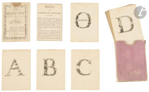 [Paris. Vers 1820]. Etui de l’époque recouvert de papier glacé rose (8,5 x 6,4 cm) renfermant titre gravé, règles, (26) cartes lithographiées.