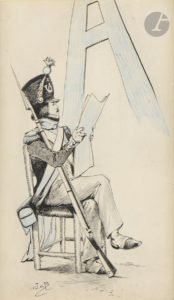 JOB. Pseudonyme de Jacques Onfroy de Bréville. — Dessin original. [Grenadier et lettre A.]. — [France. Vers 1910]. (26 x 16 cm). Encre de Chine et crayon bleu sur papier fort. Signature en pied. Sous verre, encadrement de bois blond.