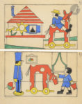 crayon noir et gouaches de couleurs primaires. La couverture montre un jeune garçon sur un cheval de bois à roulettes dans un décor de jouets de bois soclés. Chemise et emboîtage modernes de protection, recouverts de papier bleu. (Atelier Devauchelle).