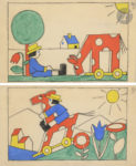 Eblouissant graphisme où elle associe formes géométriques et stylisation extrême. Sur une base de crayon gras noir, elle applique gouaches rouge, jaune, bleue et verte. Histoire sans texte mais très lisible du voyage du petit bonhomme sur un cheval à roulettes.