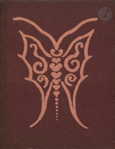 [pliés à l’anglaise : le pli côté tranche] : chemise lie-de-vin illustrée de deux papillons roses, gardes mauves illustrées.