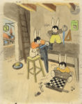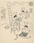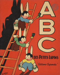 la première illustrée en couleurs, deux lapins sur une échelle peignant les lettres ABC, un troisième au sol avec un pot de peinture, casier alphabétique sur la seconde.Sont joints : (17) dessins originaux à l’encre de Chine sur papier fort et (17) dessins à l’encre de Chine mis en couleurs sur calque.