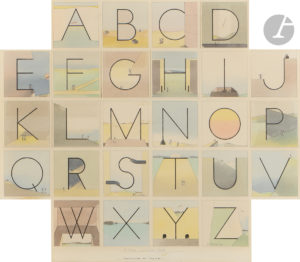 LEMOINE (Georges). — Souvenirs de voyage. [Dessins originaux]. — La Haye. Janvier 1975. Planche en forme de croix (31,5 x 36 cm environ) comportant 26 carrés de lettres aquarellées en couleurs (certains appliqués), encadrée sous verre,...