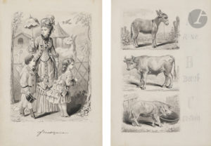 Précieux ensemble complet de neuf dessins originaux du dessinateur et lithographe Philéad Levilly (1803-1883), pour un abécédaire.