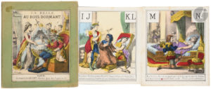 La Belle au bois dormant résumée en légendes de deux lignes en pied des planches lithographiées et coloriées au pochoir. Illustrations de Levilly, Philéad-Salvador (1803-1883), dessinateur et lithographe.