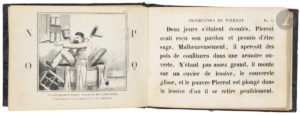 Né en 1804, il est breveté libraire en 1842 et lithographe en 1847. Son intéressante production en tant qu’éditeur débute en 1844 au 32 rue Sainte-Croix-de-la-Bretonnerie, puis au 30 à partir de 1851. Père de cinq enfants, il signe lui-même plusieurs ouvrages, les plus amusants, dont ces mésaventures d’un Pierrot-“Struwwelpeter” illustrées de seize lithographies. Elles comportent chacune quatre lettres de l’alphabet en encadrement y compris les voyelles doubles Æ, Œ, le Ç et, chose rare au XIXe siècle, le W. Ouvrage imprimé en recto, large typographie utilisée pour les manuels de premières lectures des tout-petits.