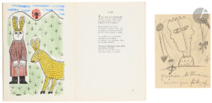 Huit planches illustrées en noir qui, dans ce rare exemplaire, ont été rehaussées à l’aquarelle par l’artiste. Vingt-huit poésies sur les animaux, le plus souvent, quatrains légers pouvant être lus à des enfants, par le fils de l’artiste, Jean-Guy Modin (Bâle 1925-2007 Sarlat).
