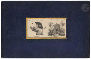 (16,2 x 25 cm). (32) pp., titre gravé, 9 planches gravées sous serpentes de papier rose : reliure de l’éditeur de papier chagriné bleu nuit, gravure de Jocrisse et Kiosque appliquée, dans un encadrement gaufré doré, sur le premier plat.