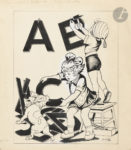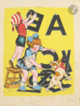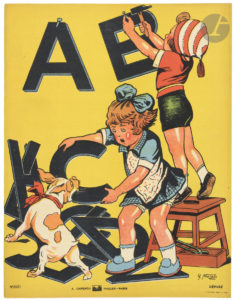 une fillette clouant au mur les lettres AB et une autre essayant de tirer de la gueule d’un chien le C.Accompagné de (17) ff. à l’encre de Chine. (35,2 x 31 cm) pour la couverture et (32 x 25 cm) environ pour les originaux des pages, (17) ff. à l’aquarelle sur une impression inversée.