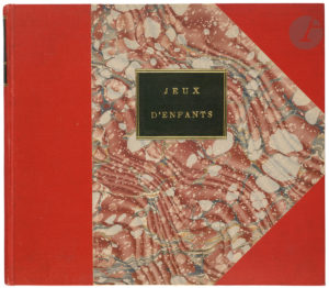 coloriées : demi-percaline rouge à coins, étiquette de veau vert, portant le titre “Jeux d’enfants”, appliquée sur le premier plat. (Reliure postérieure).