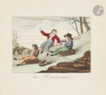 Ensemble complet représentant de jeunes garçons dans leurs jeux dans un décor d’extérieur. Les Traineaux, Les Papillons, Les Quatre-Coins, Traineaux à Piques, Le petit Palet, etc. Fines gravures à la cuve, non signées, élégamment coloriées avec le titre en pied gravé. La quatrième édition de la Bibliothèque nationale de France mentionne l’auteur et le nom du graveur, Noël Jeune, rue des Noyers, N° 47. Une première édition, vers 1807, ne comportait que vingt planches.