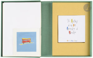 — Sont joints : l’ensemble complet des dessins originaux, en noir à l’encre, sur un carré de papier fort (25 x 25 cm au même format que les pages de l’ouvrage), un original non employé dans l’ouvrage définitif, les originaux de la typographie (couvertures et pages), cinq gouaches (essais de couleur directe) et plus de quarante feuilles de croquis (la plupart au format A4) montrant ses recherches jusqu’à l’abécédaire final, tous les dessins sont datés et signés par l’artiste.