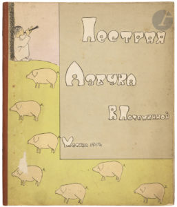 POTEMKINA (V.). — Pestraya Azbouka. [Alphabet bigarré]. — [Éditions Sté I. D. Sytin. Moscou]. 1904. In-4 (25 x 21,2 cm). (32) pp. : album de l’éditeur, dos de percaline carmin, plats lithographiés en couleurs, titre calligraphié sur...