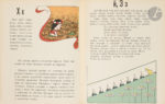 Page de titre en lettres dessinées entre des bandeaux de canards sur des flots de lignes ondulées, vingt-neuf compositions stylisées, colorées dans des pavés intégrés au texte. Fines lithographies élégantes et simples aux compositions renouvelées, un “Art nouveau” qui semble dessiné par une jeune artiste. Ses personnages et ses compositions de motifs répétés sont très innovants pour l’époque.