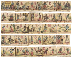 RANDON (Gilbert). — Alphabet militaire. — Au Journal amusant, 20, rue Bergère & chez Plon, éditeur, 8, rue Garancière. [Paris. Vers 1856]. (58,5 x 44,5 cm). Planche lithographiée, coloriée au pochoir, appliquée sur une planche de bois...