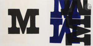 Couvertures et une lettre de l’alphabet par double page. Initiale noire, à gauche, et composition typographique aboutie, surimposée à l’encre noire et de couleur, en regard.