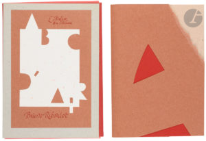 chemise à volets rouges, fort carton gris sur le dessus, avec une feuille brique et une feuille blanche découpée, appliquées.