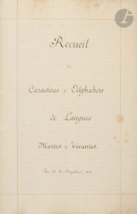 RIGAULT (A.). — Recueil de caractères & Alphabets de langues mortes et vivantes. — Par M. A. Rigault. Sans lieu. 1819. Manuscrit in-folio (40,5 x 27,5 cm). (114) pp. et feuilles volantes de différents formats et papiers, (2) ff. de...