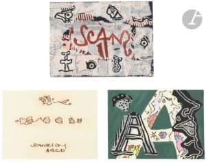 SCANREIGH (Jean-Marc). — ABCD. — Nîmes. 7 janvier 2013. Boîte de carton (19,2 x 25,6 x 3,7 cm) illustrée à l’encre et de collages avec le nom de l’artiste en rouge sur le couvercle, renfermant 26 cartons forts (18 x 25 cm)...