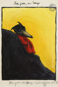 SOLOTAREFF (Grégoire). — Un jour, un loup. [Acrylique originale. Projet de couverture]. — [Paris. 1994]. Peinture acrylique sur vélin (29,5 x 21 cm). Titré, daté et portant les initiales de l’artiste. Encadré sous verre, cadre de bois...