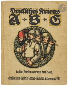 STAHL (Emil). — Deutsches Kriegs ABC. — Lustige Zeichnungen von Emil Stahl. Erschienen im Holbein-Verlag. München, Kriegsjahr 1915. In-8 (21 x 17 cm). Feuillet de titre illustré en noir, (25) planches illustrées en couleurs : cartonnage de...