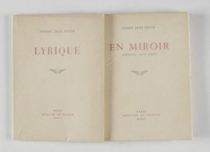 JOUVE Pierre Jean.Lyrique. Paris, Mercure de France, 1956. Pt in-8, br. Édition originale sur papier d’édition. Envoi a.s.Joint :- En miroir. Paris, Mercure de France, 1954. Pt in-8, br.