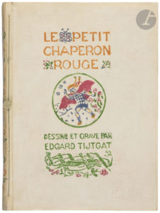 TIJTGAT (Edgard). — Le Petit Chaperon rouge. — Un conte de Perrault. Dessiné et gravé par Edgard Tijtgat. Cyril Beaumont. Londres. 1918. Petit in-4 (26 x 19,4 cm). (21) ff. doubles, (16) planches sur chine gravées en couleurs : relié à...