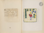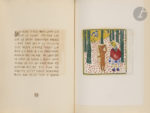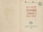 Doubles fascinantes gravures composées de planches en bistre sur lesquelles sont encartées seize planches sur Chine en couleurs. Chaperon rouge entièrement gravé sur bois et linoléum. Impression réalisée par l’artiste sur sa presse à bras, comme l’indique la dernière gravure de l’achevé d’imprimer. Naïveté toute naturelle de l’artiste. Texte gravé sur bois, vignette en bistre supplémentaire gravée en tête du livre.