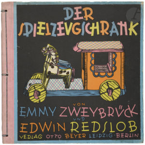 ZWEYBRÜCK (Emmy). REDSLOB (Edwin). — Der Spielzeugschrank. [L’Armoire à jouets]. — Verlag Otto Beyer. Leipzig-Berlin. [1934]. In-4 carré (24,2 x 24,2 cm). (14) doubles ff. : reliure à la japonaise de l’éditeur, avec cordonnet vert...