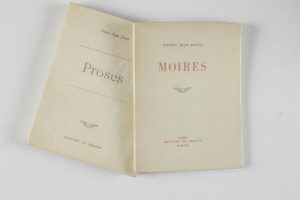 JOUVE Pierre Jean.Proses. Paris, Mercure de France, 1960. Pt in-8, br. Édition originale. 1/12 sur vélin d’Arches. Envoi a.s. sur vélin d’Arches (nom effacé).Joints :- Moires. Paris, Mercure de France, 1962. Pt in-8, br. - Ténèbres. Paris,...
