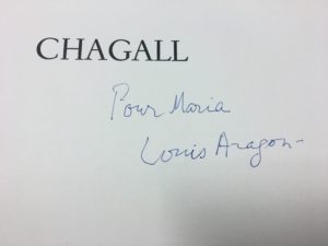 [CHAGALL]. ARAGON (Louis). Chagall l'admirable. S. l. [Paris], Maeght Éditeur, n. d. [1972]. In-folio en feuilles, sous couverture illustrée en couleurs, chemise et étui de l'éditeur. Numéro de « Derrière le miroir » consacré à Marc CHAGALL. Trois lithographies originales en couleurs dont une sur la couverture, une à pleine page et une double et reproductions en couleurs ou en noir dans le texte. Tiré à 150 exemplaires sur vélin de Rives, celui-ci (non numéroté) portant la signature de l'artiste sous la justification. Envoi deLouis Aragon à « Maria » sur le faux-titre. Quelques décharges.
