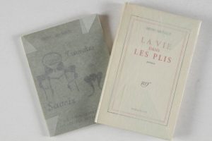 MICHAUX Henri.Tranches de savoir, suivi du Secret de la situation politique. Paris, L’âge d’or, 1950. In-16, br. s. Alfama num.Joint :- La vie dans les plis. Paris, Gallimard, 1949. In-12, br. Édition en partie originale. 1/43 sur vélin pur fil.