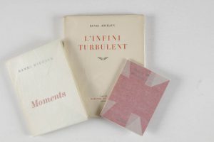 MICHAUX Henri.L’infini turbulent. Paris, Mercure de France, 1957. In-4, br. Édition originale num.Joints :- Moments. Paris, NRF Le point du jour, 1973. In-8, br. Édition originale num.- Poteaux d’angle. Paris, L’Herne, 1971. Pt in-12.