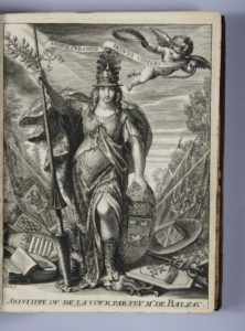 BALZAC (Jean Louis Guez de). Aristippe, ou De la Cour. A Paris, Chez Augustin Courbé, 1658. In-4°, veau, triple filet doré encadrant les plats, dos à nerfs orné (reliure de l'époque). ÉDITION ORIGINALE. Un titre-frontispice gravé. Veau craquelé ; coiffes et mors restaurés ; quelques rousseurs ; ex-libris au timbre humide (pâle) sur le titre.