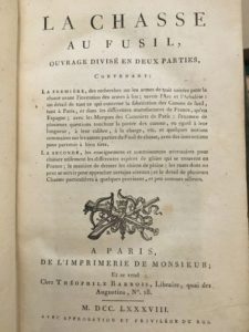 [CHASSE - MAGNÉ de MAROLLES (F. G.)]. • La Chasse au fusil. A Paris, De l'Imprimerie de Monsieur et Chez Théophile Barrois, 1788. •• Supplément au Traité de la chasse au fusil, contenant des additions et corrections importantes. A Paris, Chez Théophile Barrois, 1791. 2 parties en un volume in-8°, demi-basane à coins, dos lisse orné (reliure de l'époque). Deux vignettes d'en-tête gravées sur bois, un tableau : « Marques des canoniers de Paris », et huit planches gravées sur cuivre, dont trois repliées (avec notamment un « Plan de la Palomière de Lannes » et un « Plan géométral de la Pantière d'Igon »). Exemplaire comprenant les quatre feuillets d'« Addition au Supplément » (pp. 105-111), qui sont consacrés au chamois, au blaireau, au grèbe, au foulque et au lagopède, et qui manquent parfois. remier ouvragefrançais consacré exclusivement au fusil dechasseet à la chasseà tir, il contient en outre une importante étude sur la sauvagine. Rousseurs. Schwerdt, 1928, II, 3 ; Thiébaud, 621.