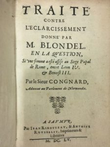 [ÉGLISE CATHOLIQUE]. CONGNARD (Pierre). Traité contre l'eclarcissement donné par M. Blondel, en la question, si une femme a esté assise au Siege Papal de Rome, entre Leon IV, & Benoist III. A Saumur, Par Jean Ribotteau & Antoine Rousselet, 1655. In-12, vélin ivoire souple (reliure de l'époque). ÉDITION ORIGINALE. Quelques rousseurs.