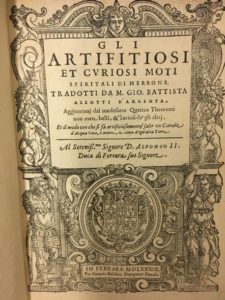 [HÉRON d'ALEXANDRIE]. Gli Artifitiosi et curiosi moti spiritali di Herrone. Traduction par Giovanni Battista Aleotti. In Ferrara, Per Vittorio Baldini, 1589. Petit in-4°, demi-vélin blanc à coins, dos lisse orné (reliure mi-XIXe s.). ÉDITION ORIGINALE. Un titre et lettrines ornés ; nombreux bois dans le texte. Feuillets légèrement roussis.