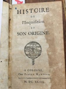 [INQUISITION - ELLIES DUPIN (Louis)]. Memoires historiques, pour servir a l'histoire des Inquisitions. A Cologne, Chez Denys Slebus, Libraire, 1716. 2 volumes in-12, veau, armoiries dorées au centre du premier plat et supra-libris au centre du second, dos à nerfs orné (reliure de l'époque). Deux titres-frontispices et six planches repliées. Des bibliothèques Jacques Vieillard et Frédéric et Anne Max, avec ex-libris. Une coiffe accidentée, mais EXEMPLAIRE aux ARMES & au SUPRA-LIBRIS BONNIER de La MOSSON. JOINT : [MARSOLLIER]. Histoire de l'Inquisition et son origine. A Cologne, Chez Pierre Marteau, 1693. In-12, veau, dos à nerfs orné (rel. de l'ép.). Acc. ENSEMBLE TROIS VOLUMES.