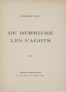 PÉRET Benjamin.De derrière les fagots. Paris, Éditions surréalistes, 1934. In-8, br. Ed. originale. 1/222 sur bouffant.