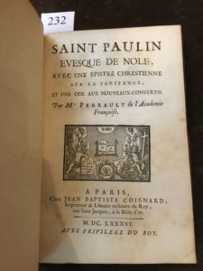 PERRAULT (Charles). Saint Paulin evesque de Nole, avec une epistre chrestienne sur la penitence, et une ode aux nouveaux-convertis. A Paris, Chez Jean-Baptiste Coignard, Imprimeur & Libraire, 1686. Petit in-8°, veau tacheté, dos à nerfs orné (reliure de l'époque). ÉDITION ORIGINALE de cet ouvragepeu commun du célèbre auteur de contes. Sept bandeaux par Sébastien Leclerc, dont le premier aux armes du dédicataire Jacques Bénigne Bossuet, évêque de Meaux. Marque de l'imprimeur au titre. De la bibliothèque de « Jean Ber a mans cledon », avec ex-libris. Premier mors fendillé en tête. Brunet, IV, 509.